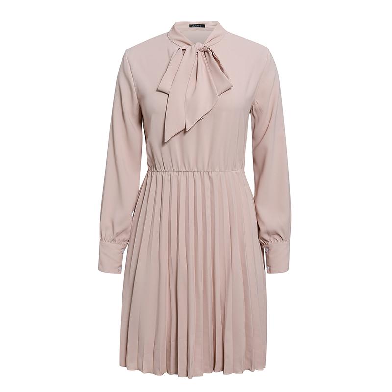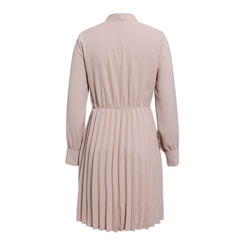 The dress features a beautiful solid pink color that exudes femininity and grace. Its knee-length pleated silhouette flatters a variety of body types, making it a versatile choice for any occasion. Whether you're heading to the office, attending a business meeting, or enjoying a casual outing, this dress will ensure you look polished and professional.