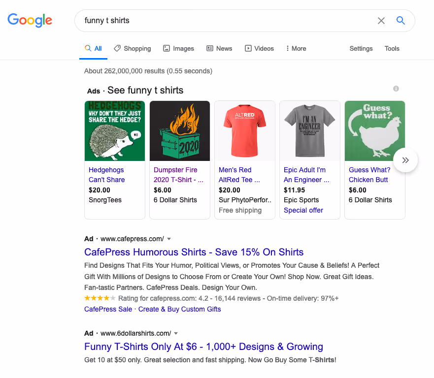 Si su presupuesto de marketing se extiende a las campañas publicitarias, la publicidad dirigida es una gran inversión. Las herramientas de campaña que puedes usar durante los períodos de mayor consumo, como Google Ads, Facebook Ads e Instagram, te permitirán llegar a un mayor volumen de clientes potenciales que compran específicamente diseños de camisetas.