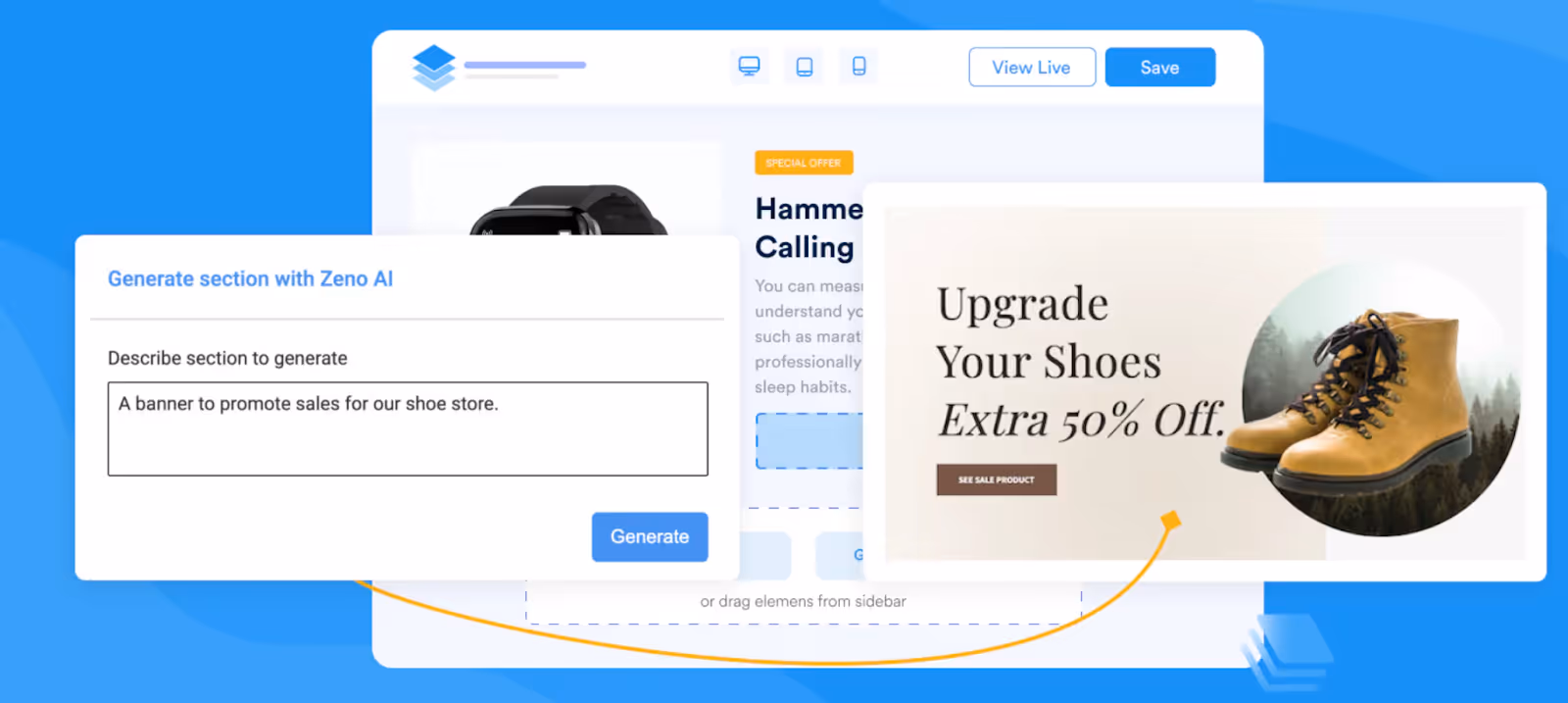 Zeno est une application d'intelligence artificielle pour les pages de destination Shopify. C'est vrai, cet outil vous permet de créer facilement de superbes pages. Fournissez simplement une invitation et il gérera les étapes de création. L'application génère également des textes attrayants que vous pouvez personnaliser pour les adapter à la voix de votre marque