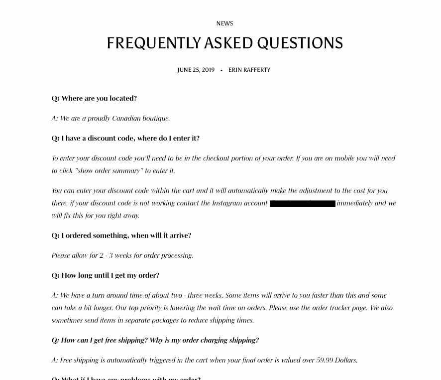 - Volevo che tutte le politiche di restituzione, le politiche sulla privacy, le informazioni di contatto e le informazioni legali fossero accessibili su ogni pagina. E hai delle domande frequenti! Ne hai bisogno se vuoi che i tuoi clienti ti vedano come un'azienda legittima.