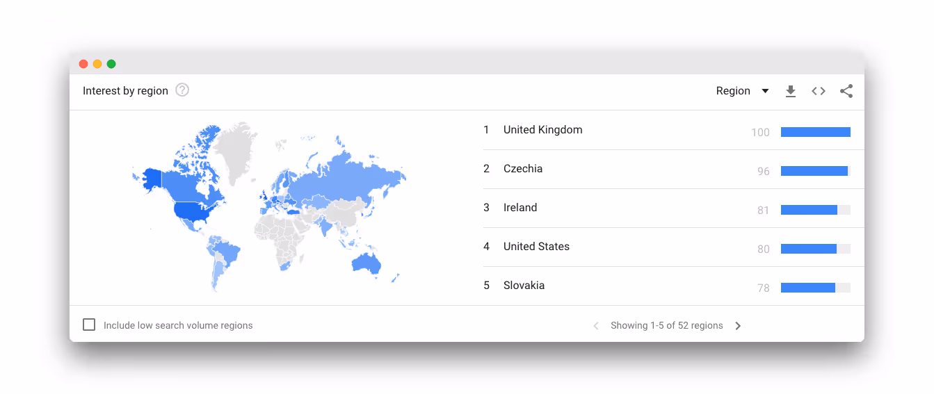 Se visualizzi le ricerche di leggings per regione, è evidente che gli Stati Uniti sono il posto giusto per iniziare a vendere leggings!