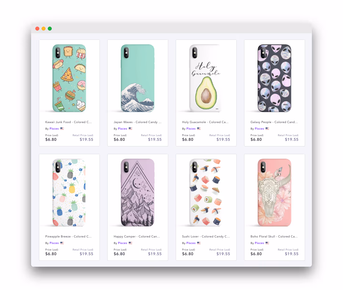 Le varianti disponibili per i prodotti sono infinite: dalle custodie per telefoni a tema a quelle trasparenti, sono disponibili design per tutti i generi. Anche se non hai un negozio dedicato alle custodie per telefoni, ma hai invece un negozio dedicato ai cani, puoi avere custodie per telefoni con cani presenti nel tuo negozio, come upsell!